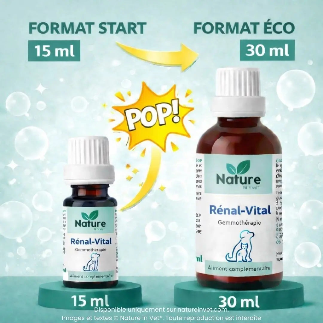 👉 Renal Vital est un complément alimentaire naturel en gemmothérapie, spécialement formulé pour soutenir les reins et le système urinaire, améliorer l’élimination des toxines, réduire les inflammations et soulager les troubles urinaires chez les chiens et chats sensibles ou âgés.